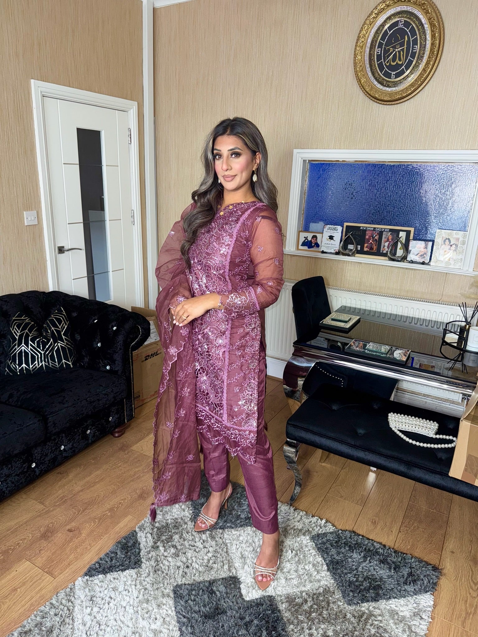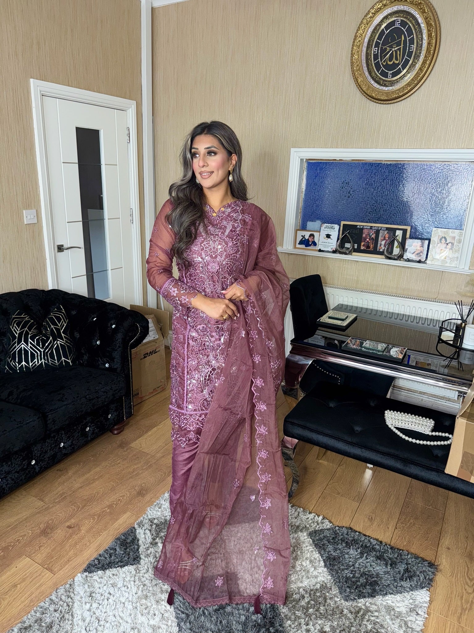 • Load image into Gallery viewer, Mauve Embroidered Shalwar Kameez with Net duppatta fully stitched 3 piece suit with Net Dupatta MOB-C1924B