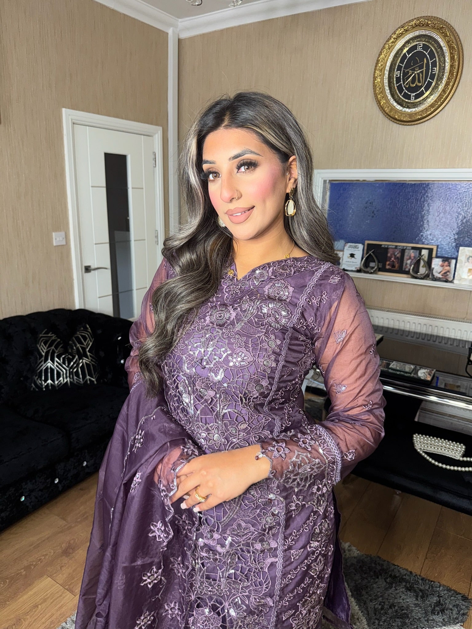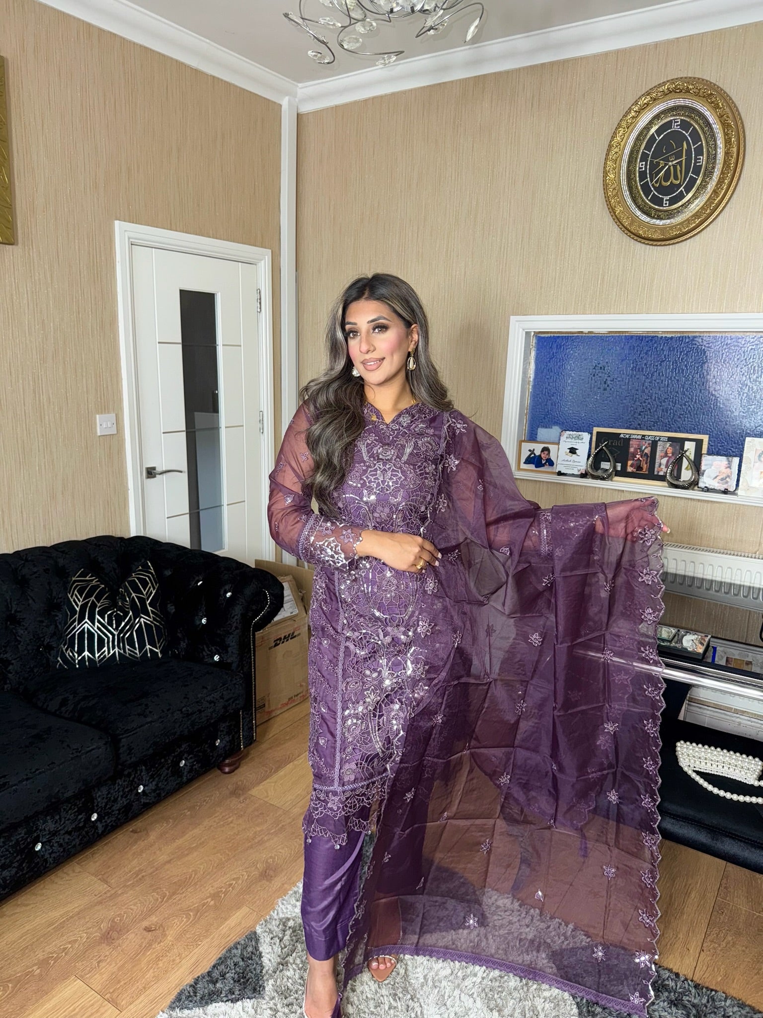 • Load image into Gallery viewer, Purple Embroidered Shalwar Kameez with Net duppatta fully stitched 3 piece suit with Net Dupatta MOB-C1924